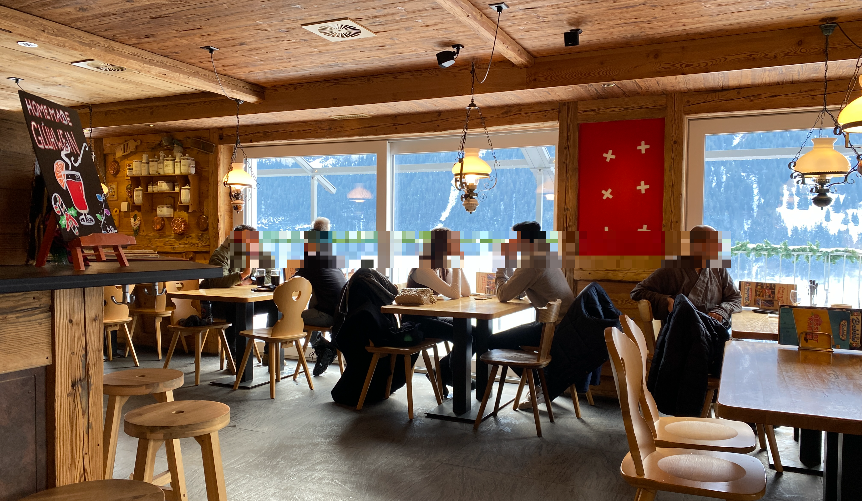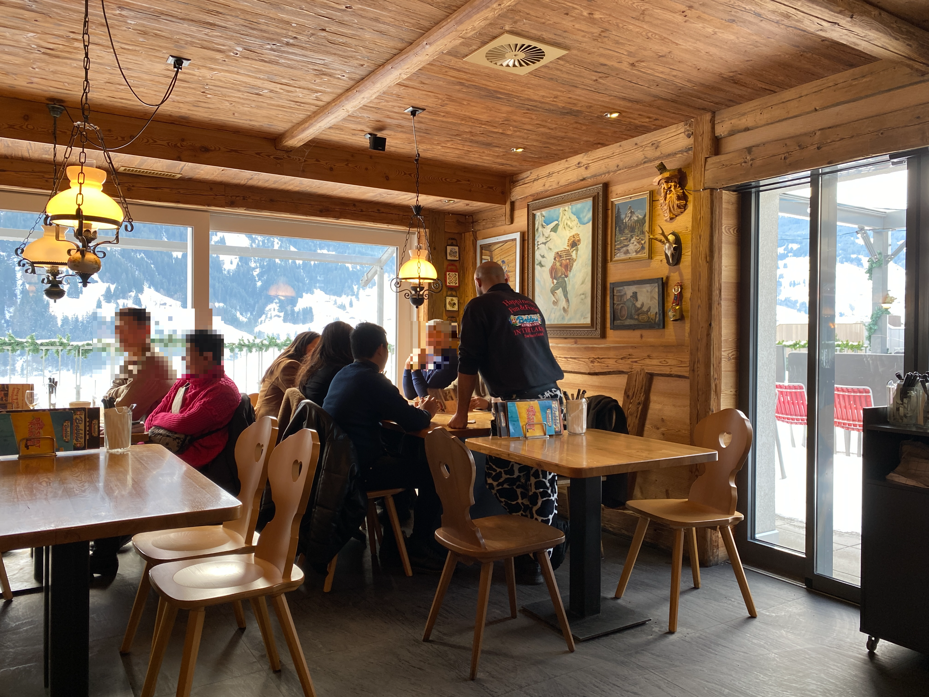 우리도 오른쪽 창가자리에 앉았으니 이미 만석이었다. 아쉬운 데로 아이거벽뷰 창이 보이는 입구 쪽에 자리를 잡고 앉아보았다.