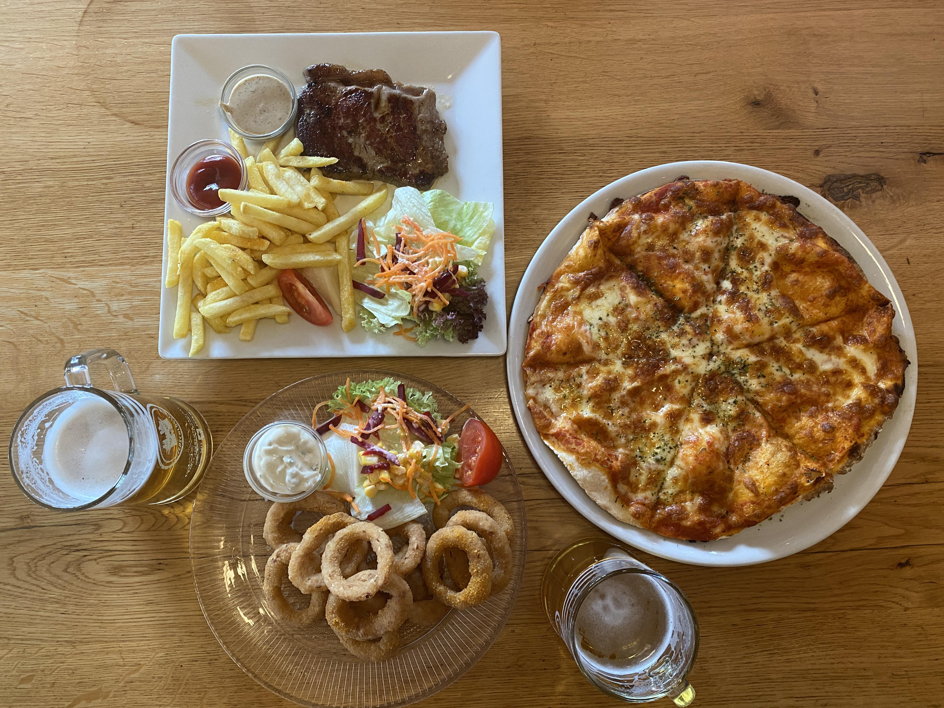우리는 피자(무슨 피자였는지 기억이 안 난다...), 어니언링, 송아지고기 스테이크, 그리고 곁들여 먹을 맥주 두 잔을 주문하여 먹어보았다.